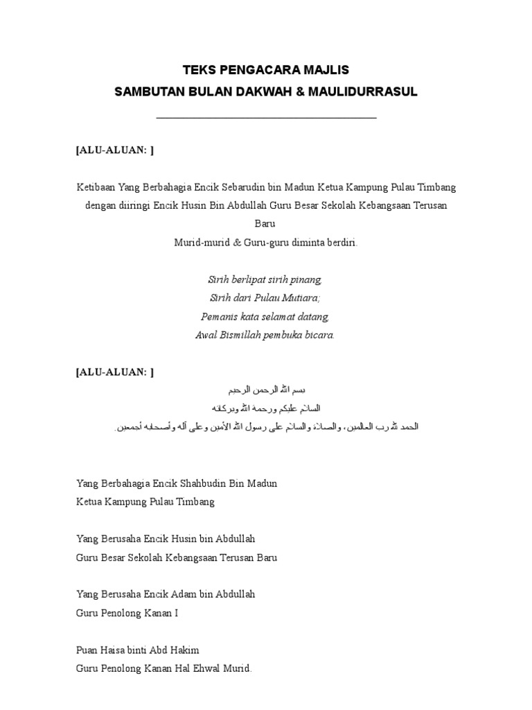 Barisan guru besar dan pengetua. Mini website sebagai sarana berbagi pengetahuan. Ucapan aluan pengerusi pibg meneruskan aturcara pada pagi ini, majlis dengan hormatnya mempersilakan yg mulia che ku jusoh b. Teks pengacara seminar kemuncak simple di um, 4 disember 2011. Teks ucapan guru bertugas mingguan. Video ni kalau tengok guna headphone beatsaudio lepas tu smbil makan biskut n air teh baru best. Burung pipit burung helang, terbang tinggi tidak sejajar; Biar sejuta rintangan menghalang, tetapku gagah teguh mengajar. Sesungguhnya dengan rasa amat besar hati, kami sekeluarga juga menerima kehadiran tuan dengan penuh rasa gembira dan penuh kesyukuran. Terima kasih saudara pengerusi majlis tuan puan datang bertandang. Muat turun teks ucapan di sini. Bencana alam seperti tsunami, gempa bumi, banjir bandang, tanah longsor, gunung meletus, angin topan, angin puting beliung, hujan es. Malam jalinan kasih (14 dis 2012).
